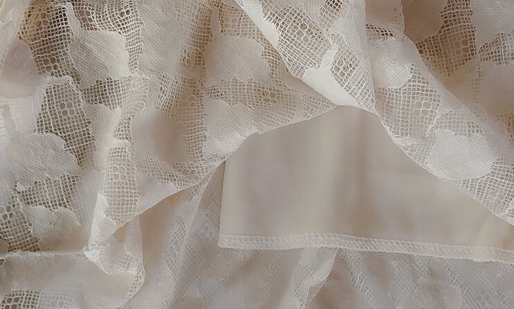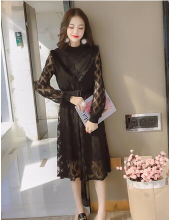 全2色 シフォンワンピース ドレス ミモレ丈 レース ハイネック 長袖 デート お呼ばれ 刺繍 大人可愛い フェミニン