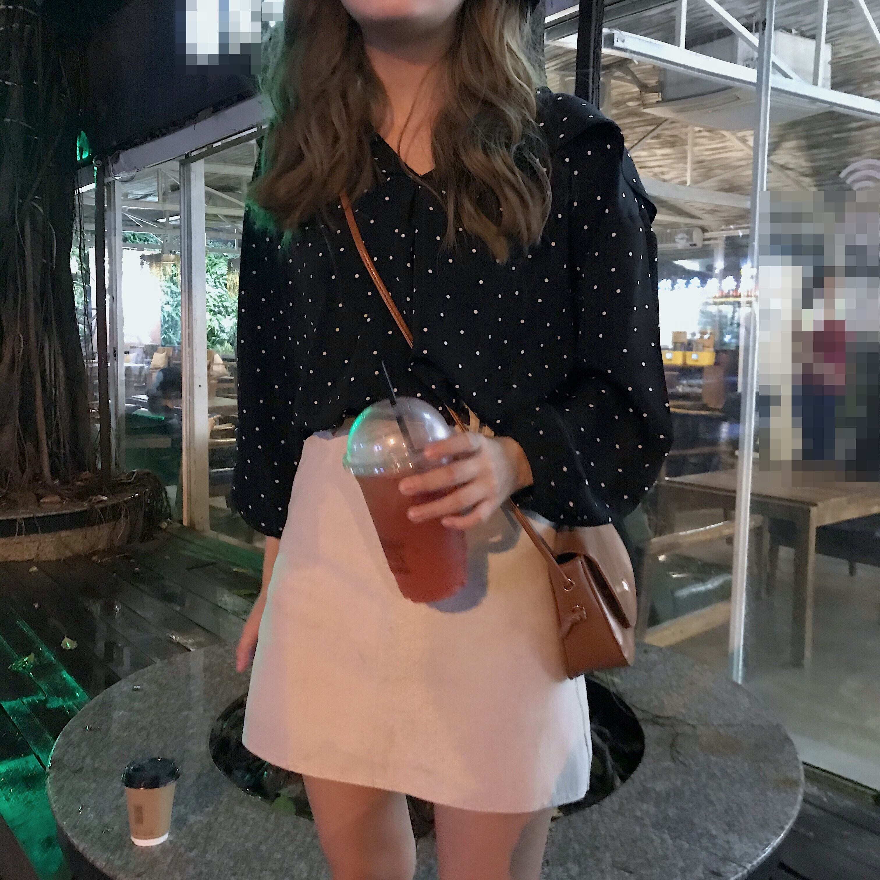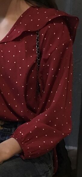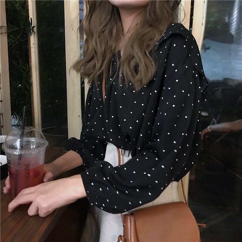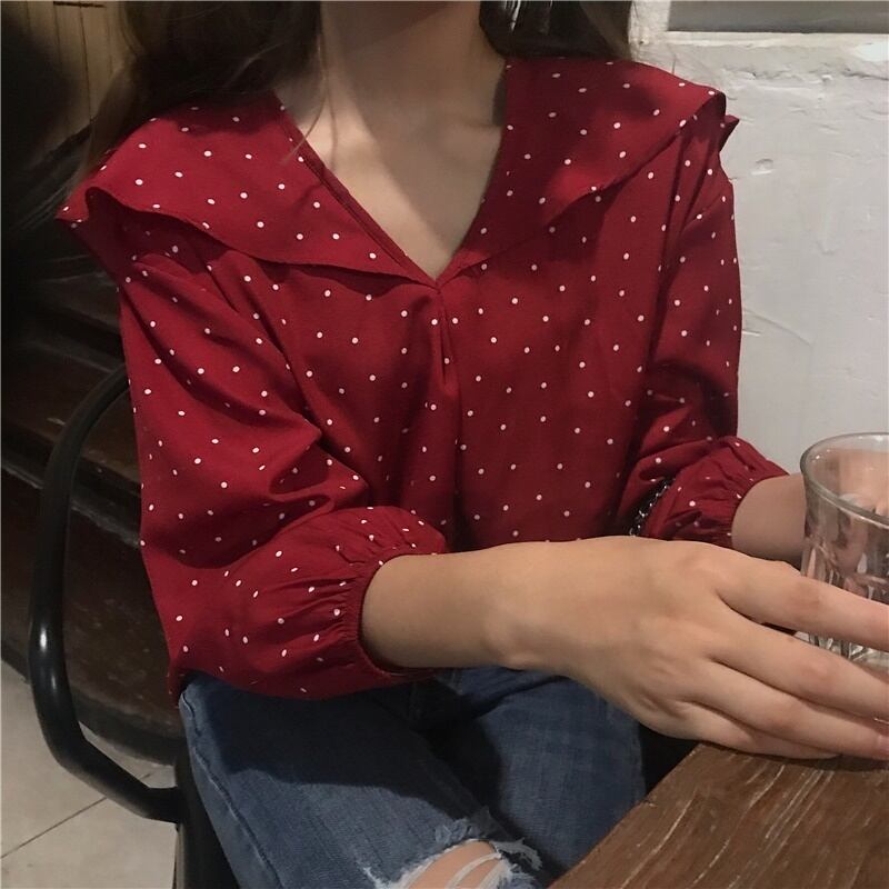 全2色 ボトミング シャツ ブラウス トップス Vネック 襟付き フレア ドット柄 大人可愛い 落ち着いた色合い ブッファン・スリーブ シック デート