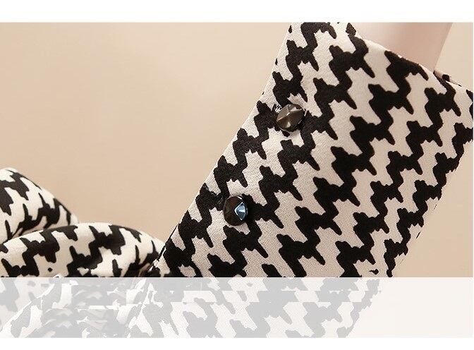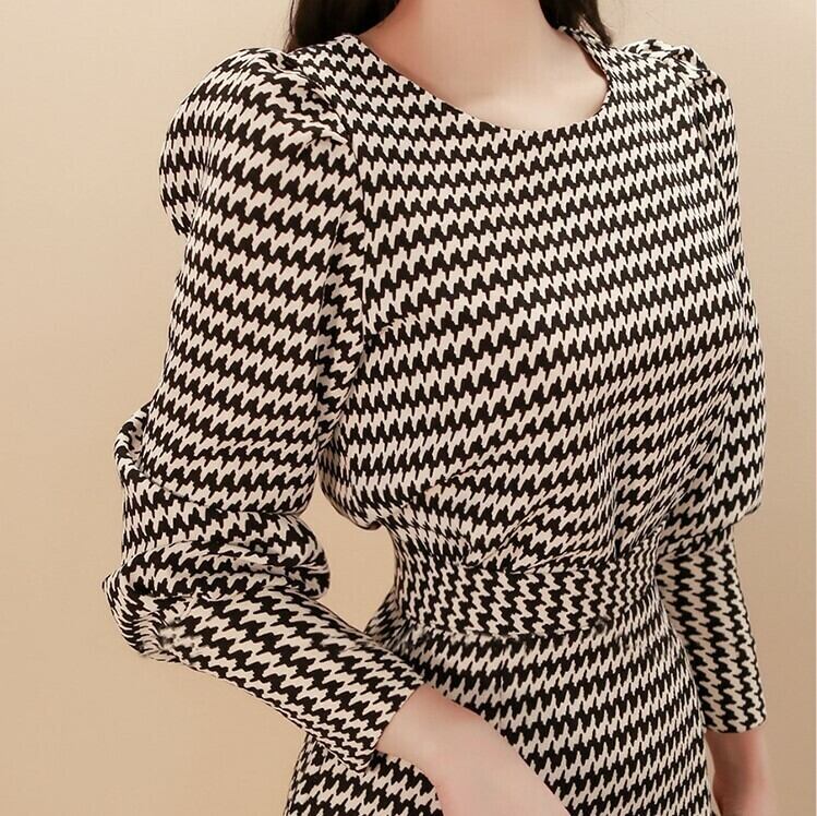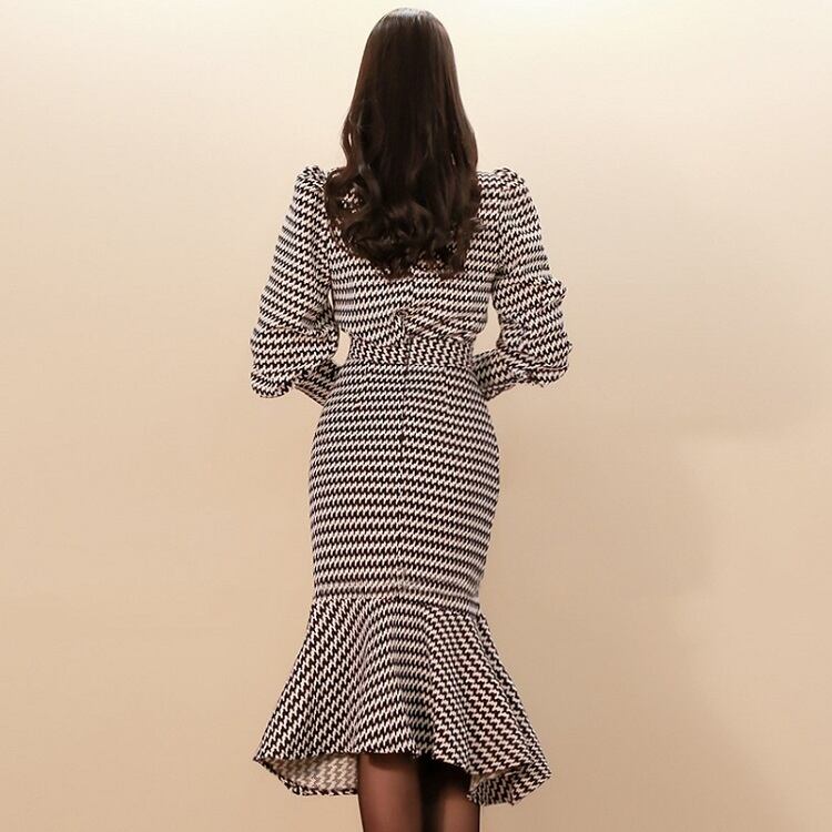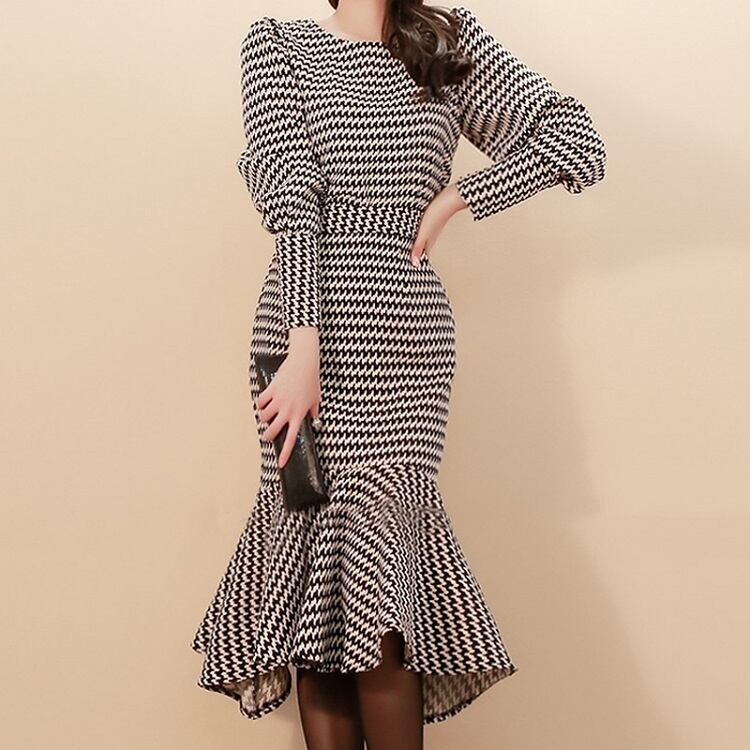 セットアップ ラウンドネック マーメイド フィッシュテール 千鳥格子 タイトスカート ハイウエスト 長袖 きれいめ フェミニン セクシー お出かけ オフィス 秋冬 デート