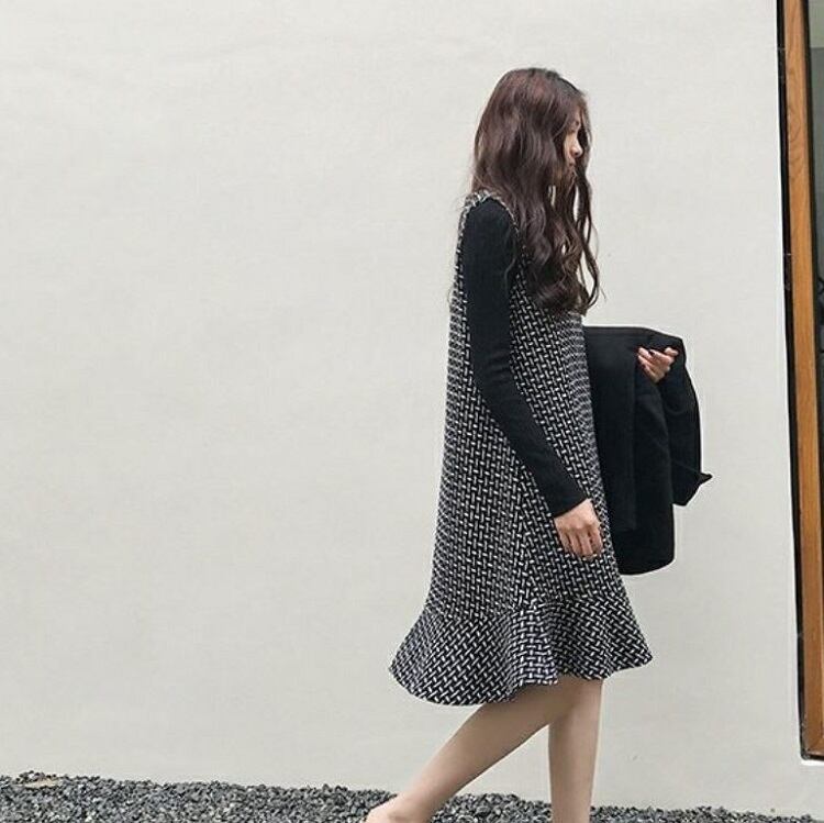 大きいサイズ セットアップ ワンピース ジャンパースカート ひざ丈 タートルネックセーター フィッシュテール チェック きれいめ お出かけ 秋冬 オフィス デート