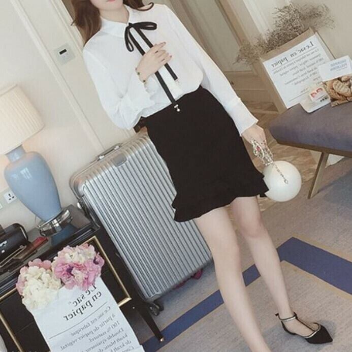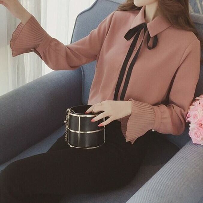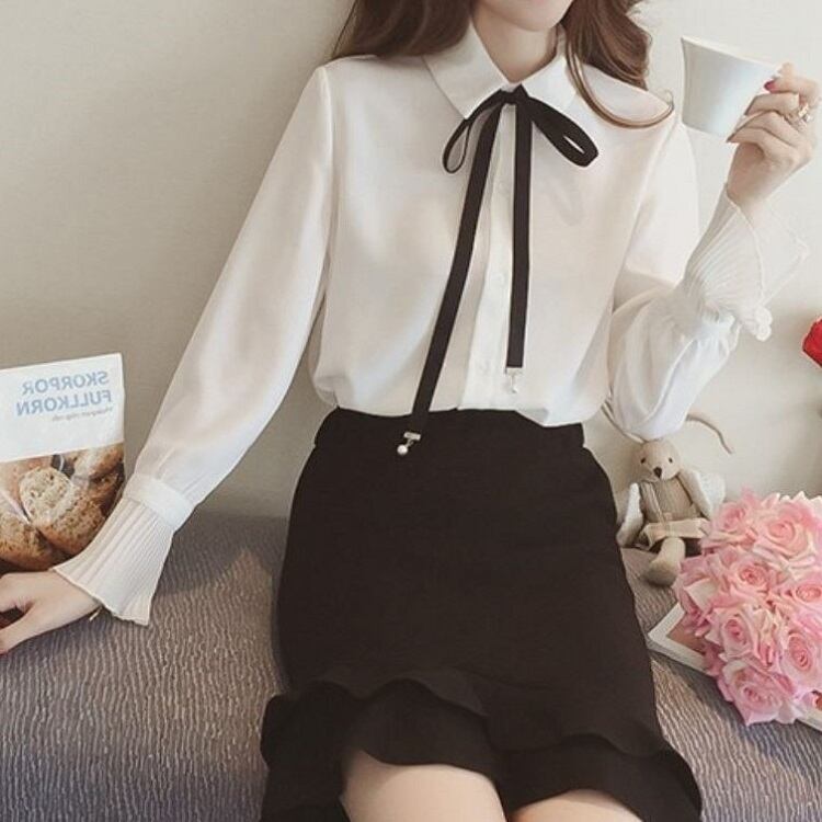 袖口の細かいプリーツと胸元のリボンが清楚な印象のブラウスです。