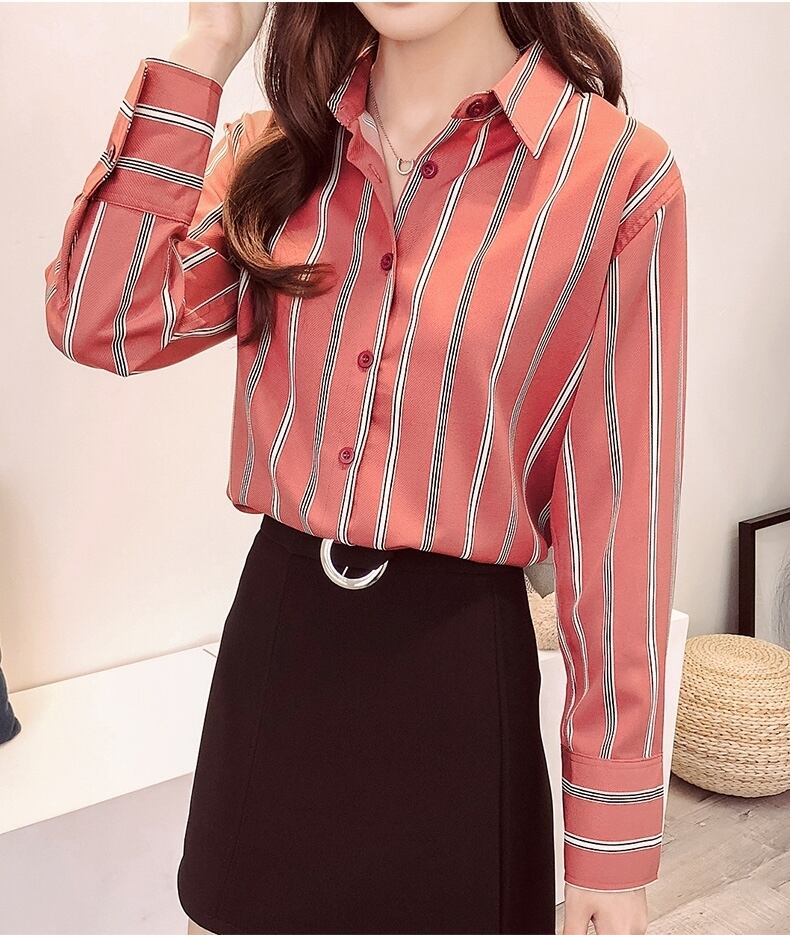 全2色 シャツ ブラウス トップス 上品 オフィス ストライプ ポロネック 長袖 カジュアル きれいめ Vネック 秋 大人 可愛い