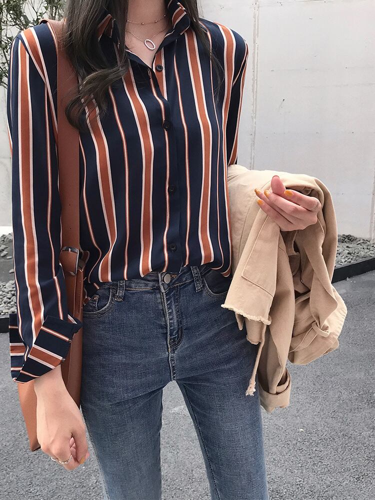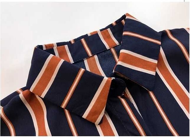 全2色 シャツ ブラウス トップス ストライプ 前ボタン オフィス ポロネック バイカラー カジュアル 大人 トレンド レトロ きれいめ