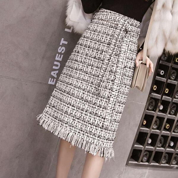 ハイウエストスカート ひざ下丈 チェック柄 ウエストリボン フリンジ 秋冬 レトロ 大人可愛い デート お出かけ デイリー 20代