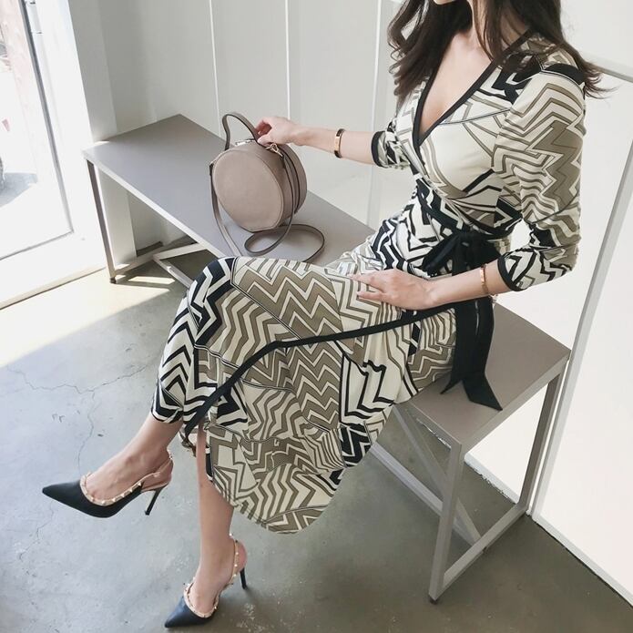 大人レディな雰囲気を演出するⅤネック&タイトシルエットのワンピース。裾のスリットをワンポイントに、ややハイウェストの切替モチーフで、シックで上品見えな装いを表現♪