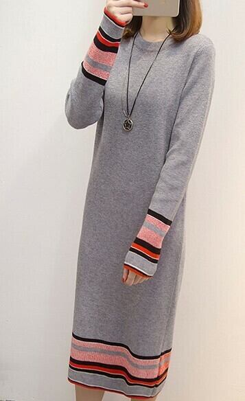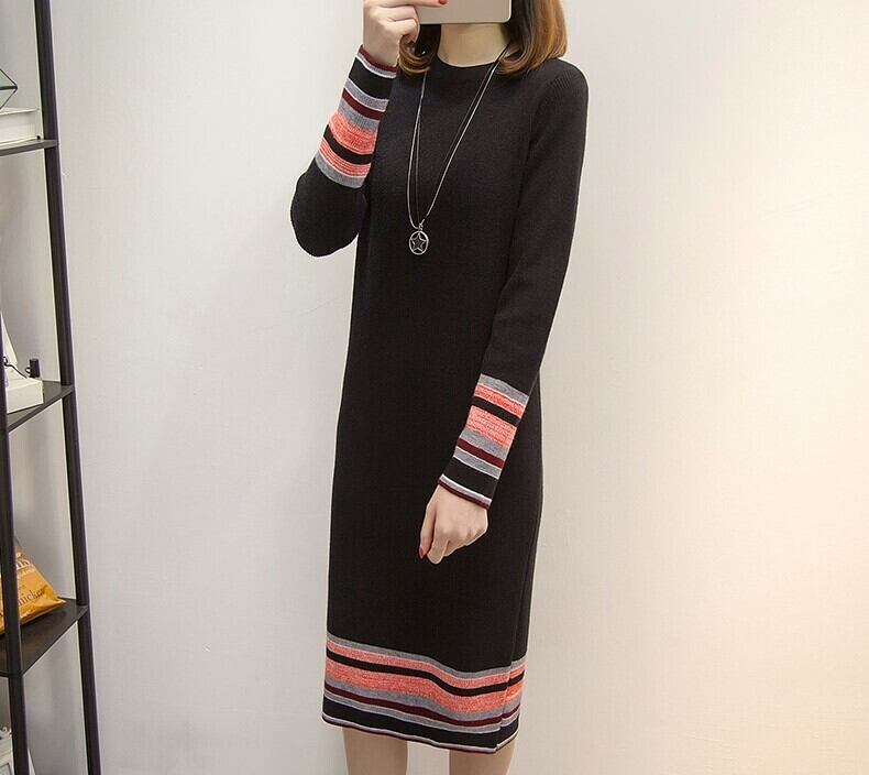 全2色 カラーライン マルチカラー ボーダー ニットワンピース ドレス ひざ丈 ミモレ丈 長袖 スリム タイト ラウンドネック 上品 大人カジュアル 秋 冬 シンプル ベーシック 韓国 オルチャン
