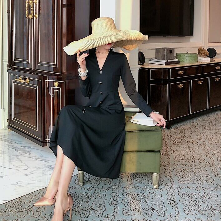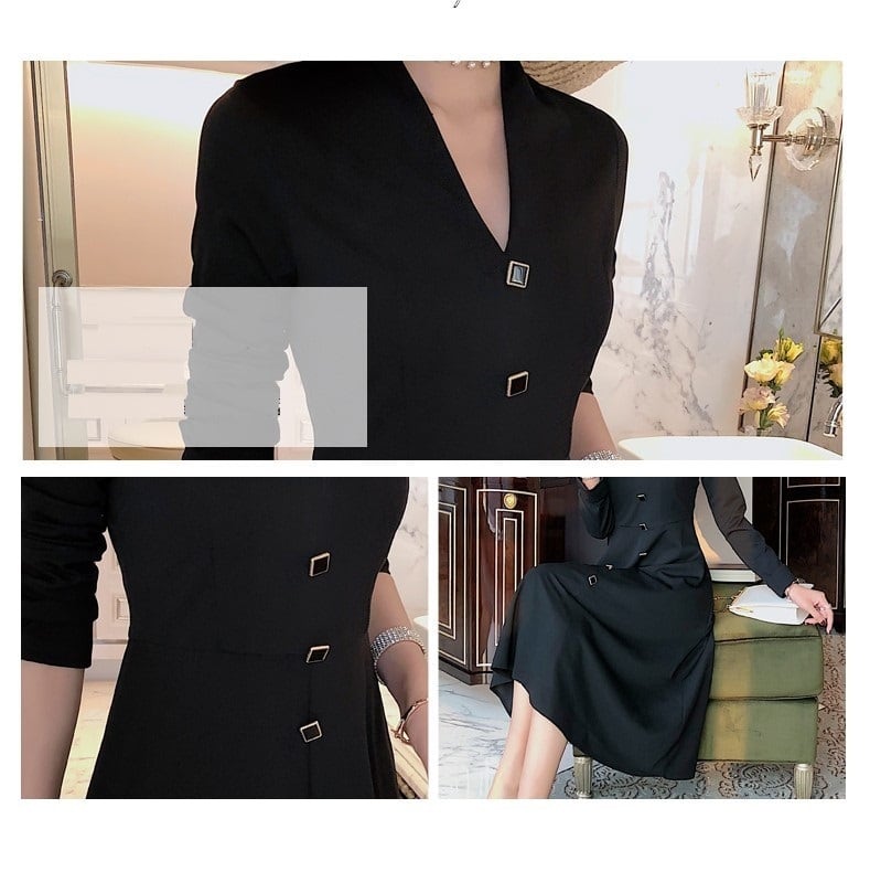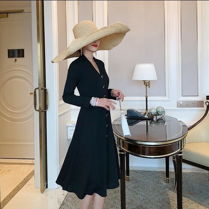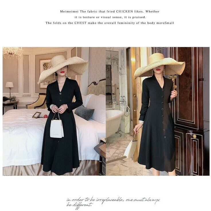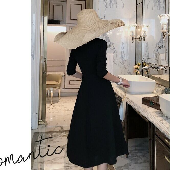 ワンピース ドレス ひざ丈 ミディ丈 Vネック フロントボタン フレアスカート 長袖 無地 大人可愛い きれいめ フェミニン お出かけ デート パーティ 秋冬 ブラック