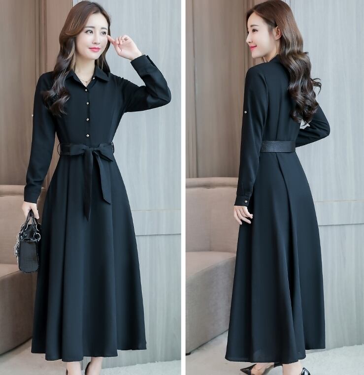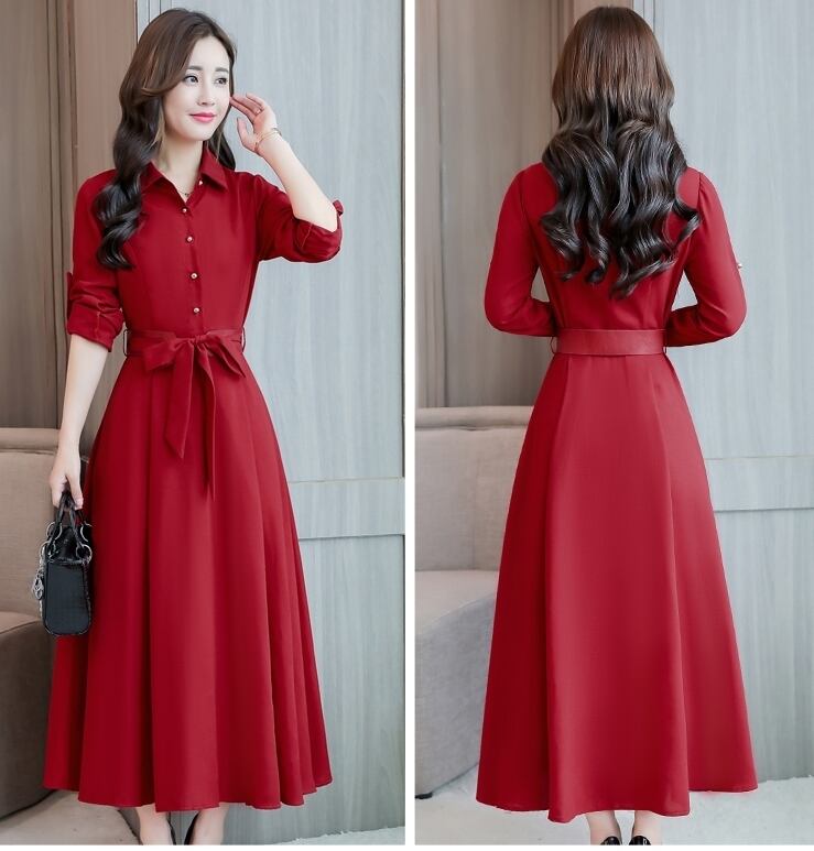 全4色 ワンピース 袖コンシャス 長袖 シャツワンピース パフスリーブ ロング丈 リボン ボタン フレア Vネック 上品 シルエット カジュアル 7分袖