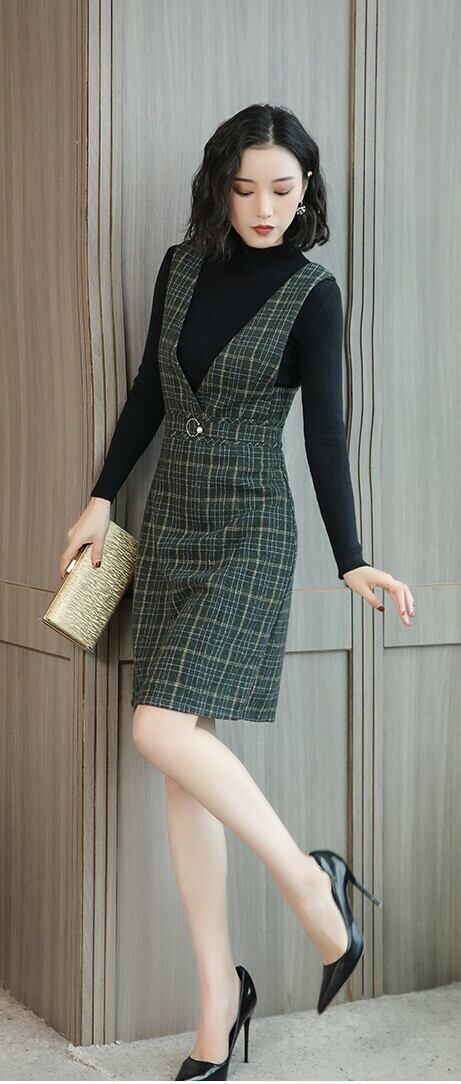 全2色 ツーピース ウール ワンピース チェック 膝丈 ミディ丈 Vネック 大人カジュアル ジャンパースカート 秋 オフィス 通勤着 重ね着 韓国 オルチャン