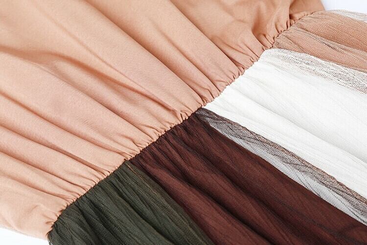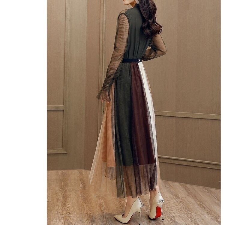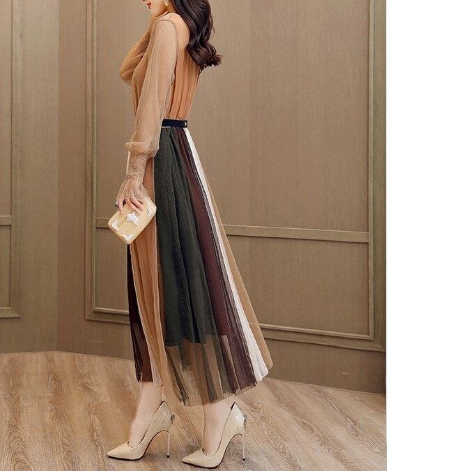 全3色 ワンピース ドレス チュールワンピース ロング丈 マキシ丈 長袖 透け感 シースルー ウエストゴム 切り替え フレア ダブルスカート 秋冬 パーティ 結婚式 二次会 アーミーグリーン キャラメル アイボリー