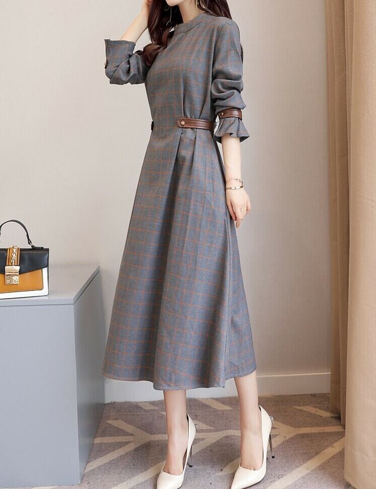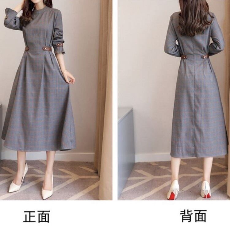 ワンピース ミモレ丈 長袖 ラウンドネック グレンチェック きれいめ 上品 オフィス 通勤 お呼ばれ デート パーティ グレー 秋冬