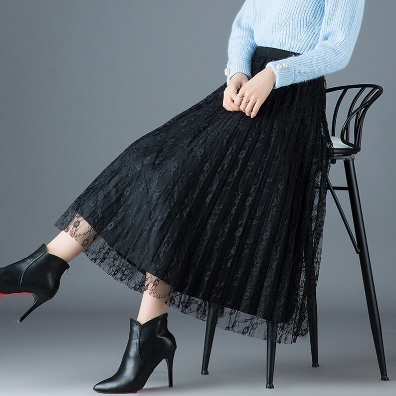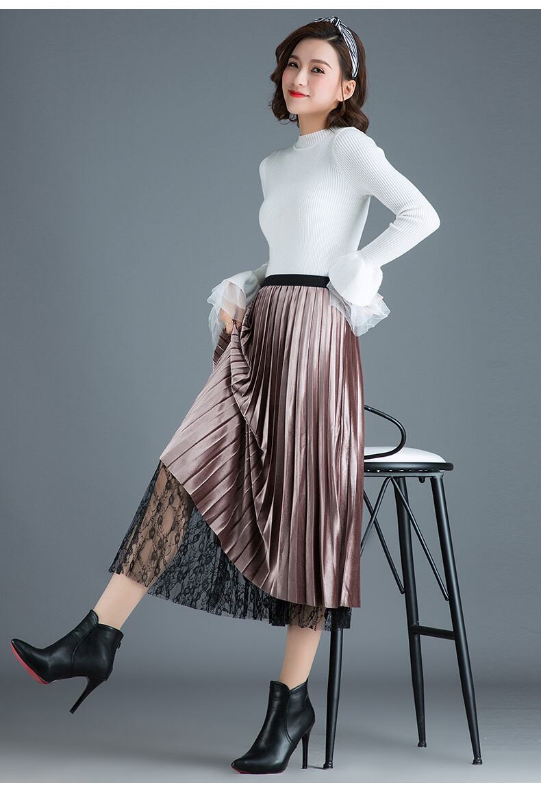 全4色 スカート ボトムス リバーシブル ウエストゴム プリーツ ハイウエスト 光沢 ベルベット ミモレ丈 フレア エレガント きれいめ シック 上品 レース 秋 冬
