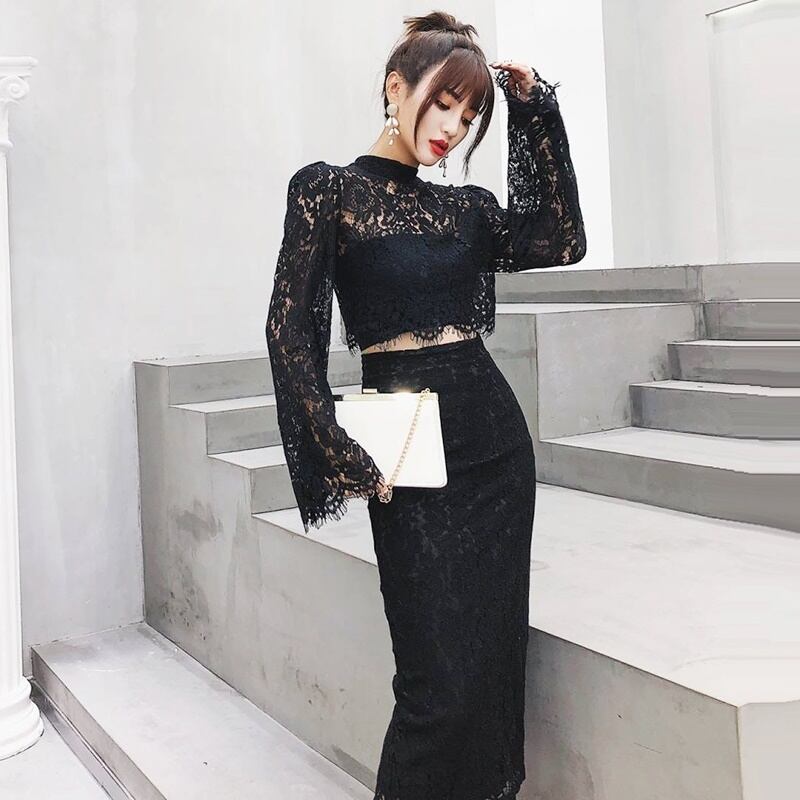 セットアップ レース ひざ丈 透け感 セクシー エレガント 秋冬 二次会 長袖 タイトドレス 黒 ブラック フレア袖