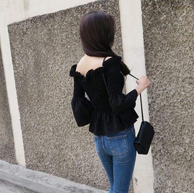 トップス ブラウス オフショルダー フリル ベル袖 袖コンシャス フレアスリーブ タイト 無地 秋 トレンド カジュアル