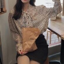 全2色 ブラウス シャツ ドット柄 水玉 ネックリボン 長袖 シフォン 秋冬 レトロ 大人可愛い デート お出かけ デイリー 20代
