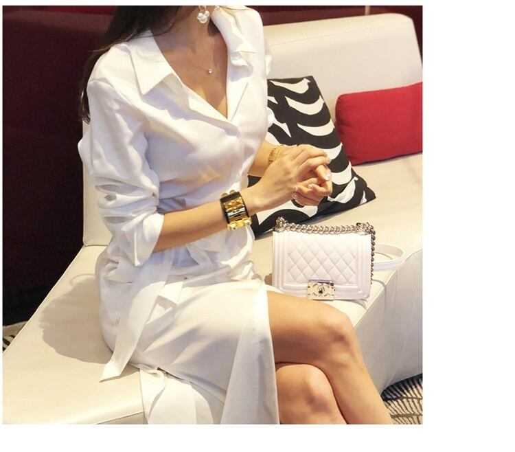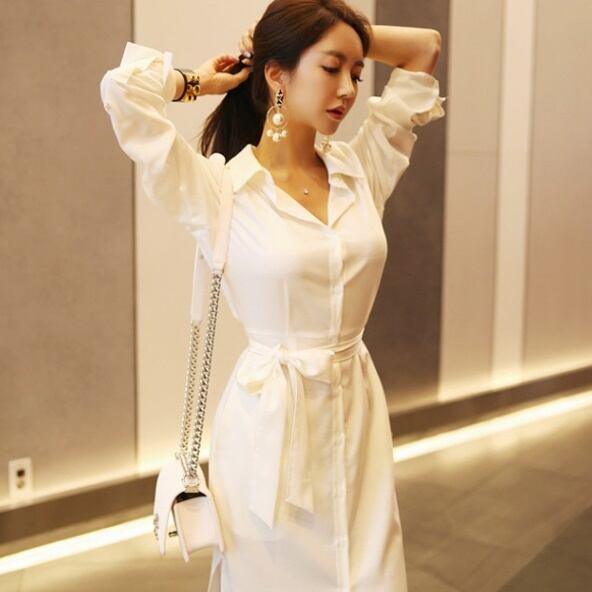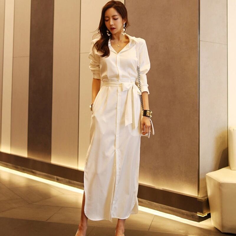 シャツワンピース ホワイト ロング丈 スリット 長袖 お出かけ デート 着痩せ 秋冬 フォーマル エレガント
