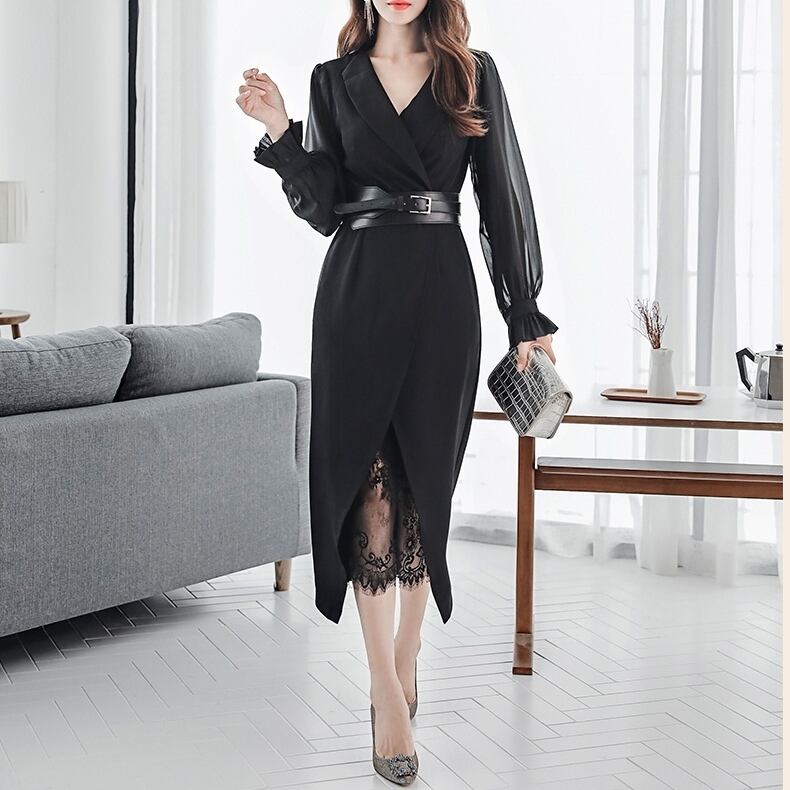 シースルーとスリットから見えるレースがセクシーなお呼ばれワンピ。