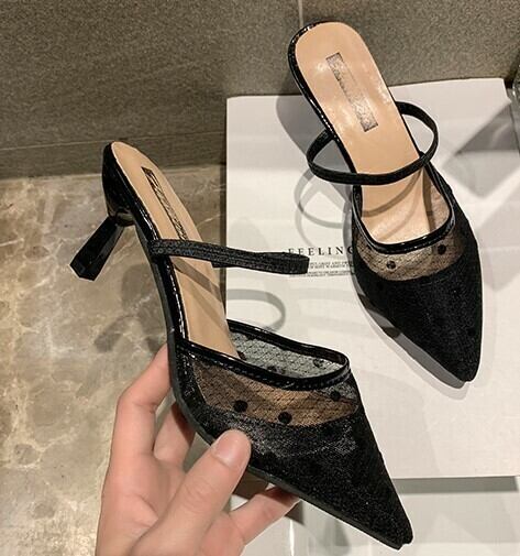 全2色 パンプス サンダル ドット 水玉柄 ミュール シンプル 透け感 ポインテッドトゥ レトロ シンプル エレガント