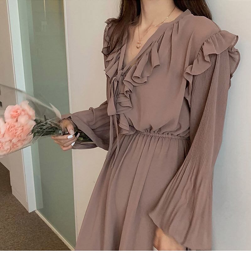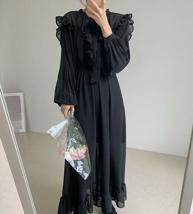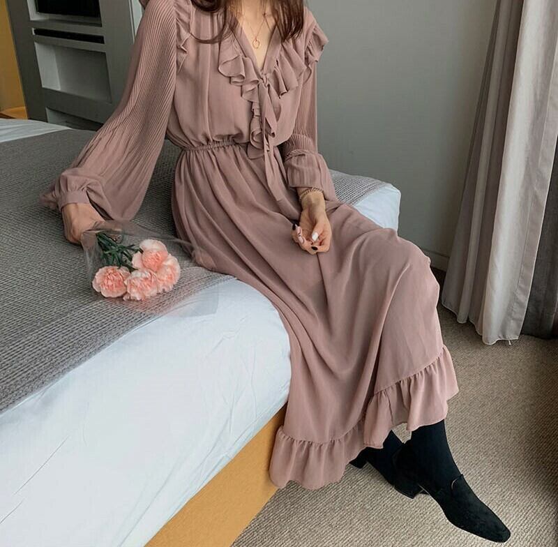 全2色 フリル ロングワンピース シフォンドレス マキシ丈 リボン 長袖 レトロ ウエストゴム Vネック 甘い エレガント