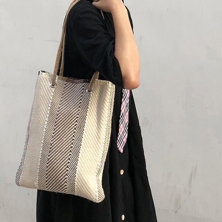 ストローバッグ ショルダーバッグ カジュアル お出かけ 秋冬 ストライプ トートバッグ ナチュラル
