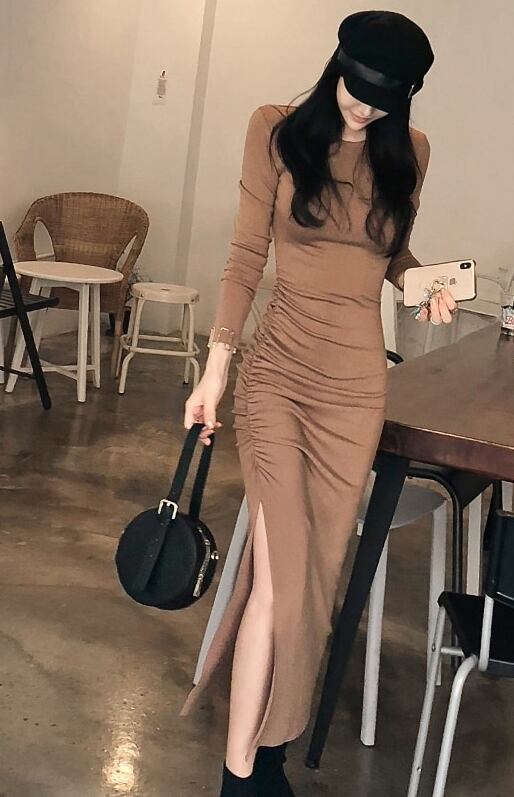 ワンピース スリット 長袖 ドレップ タイト セクシー 上品 秋 春 クルーネック ロング丈 デート きれいめ カジュアル 無地