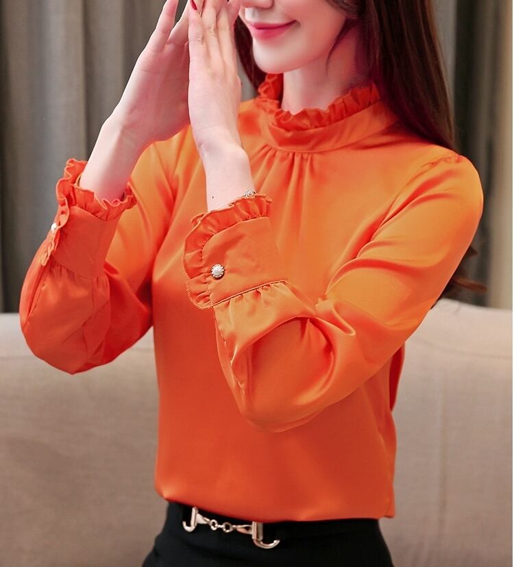 全4色 ブラウス トップス フリル ハイネック 長袖 ボタン パフスリーブ きれいめ エレガント 上品 大人 光沢 タック 秋 春