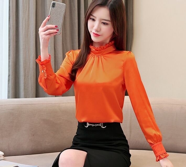 光沢のある生地を使用した長袖ブラウス。