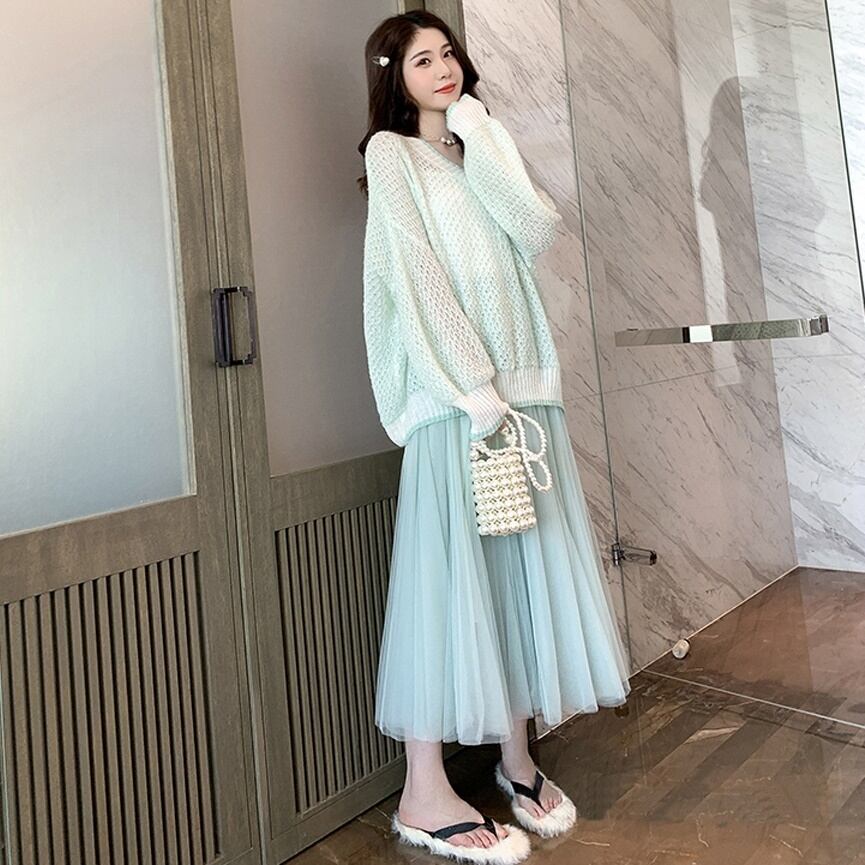妖精のようなふわふわセーターとシフォンスカートのセットアップです!