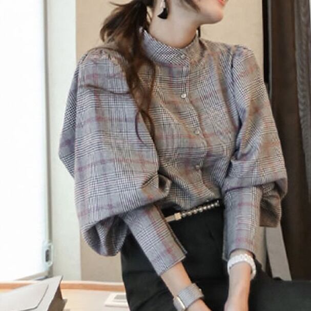 シャツ ブラウス トップス レディース グレンチェック柄 バックリボン バックコンシャス ランタンスリーブ 秋冬 レトロ 大人可愛い デート お出かけ デイリー 20代