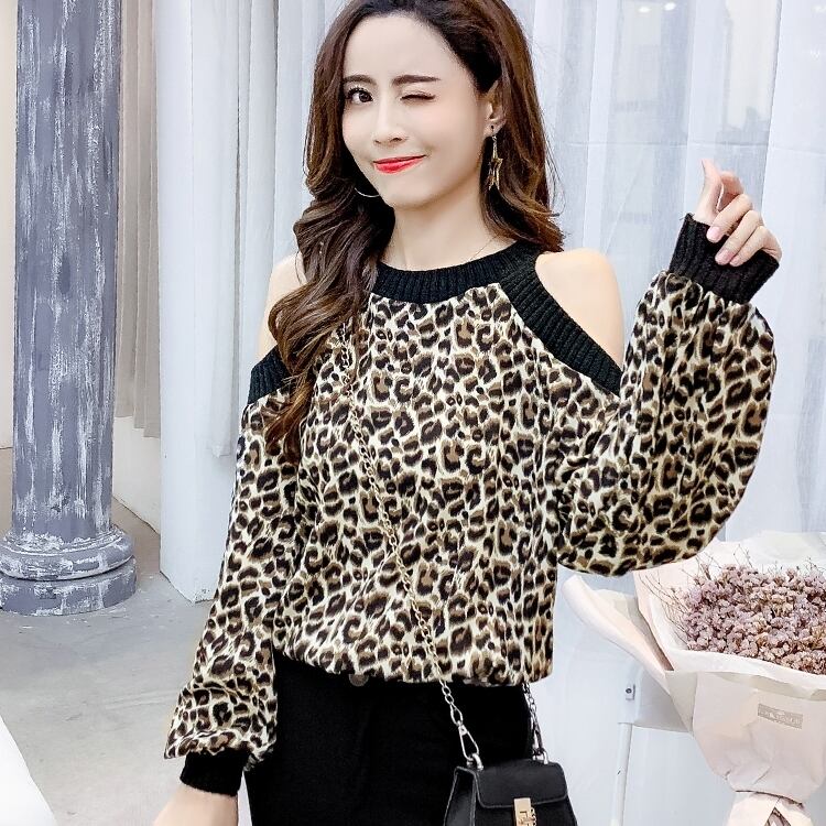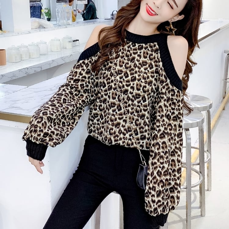 全2色 トップス アニマル レオパード ヒョウ柄 肩だし 肩開き パフスリーブ マニッシュ ルーズ ラフ 薄い 長袖 肌見せ