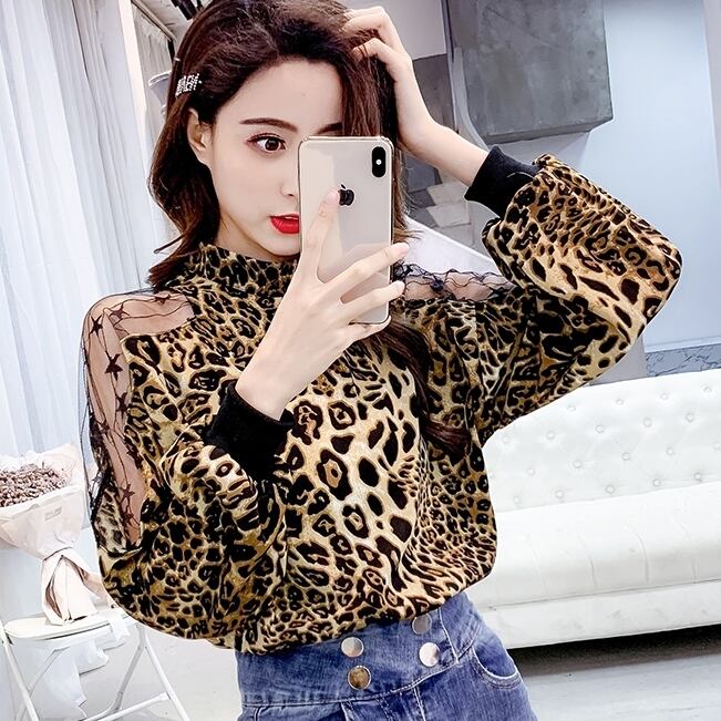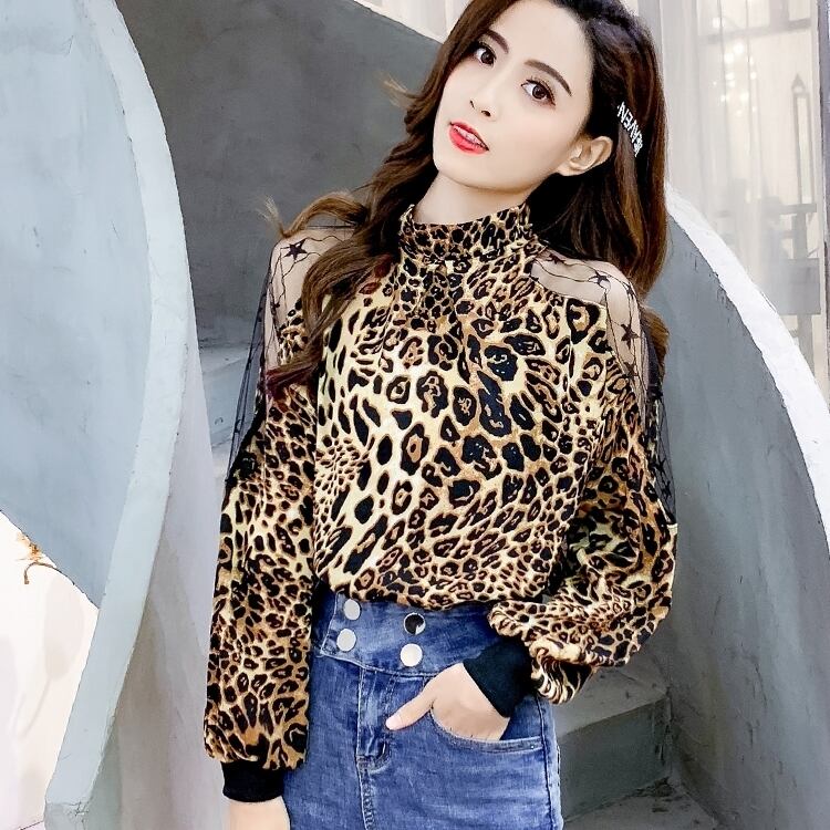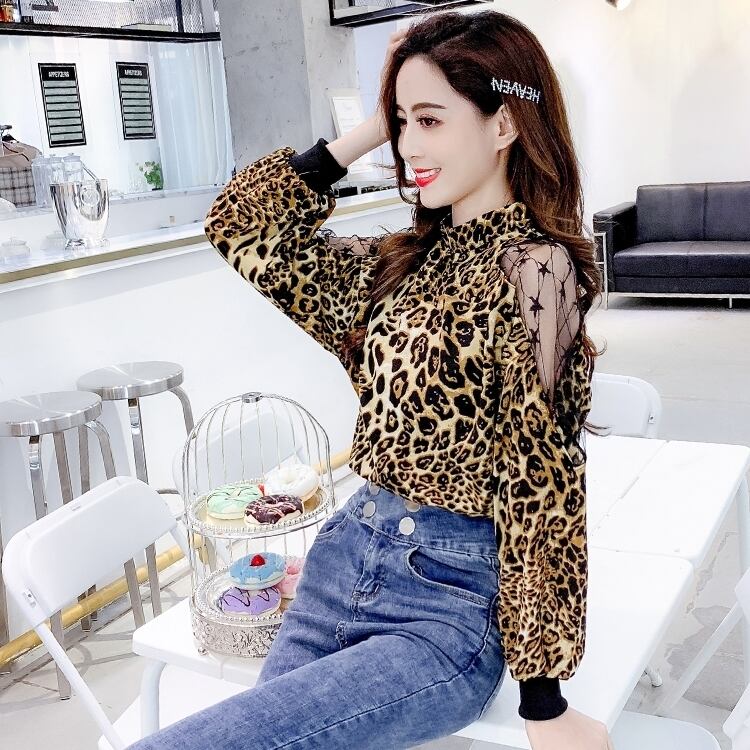 全2色 シースルー アニマル レオパード 星 長袖 ホルターネック トップス 肩だし メッシュ 大人可愛い 派手カワ