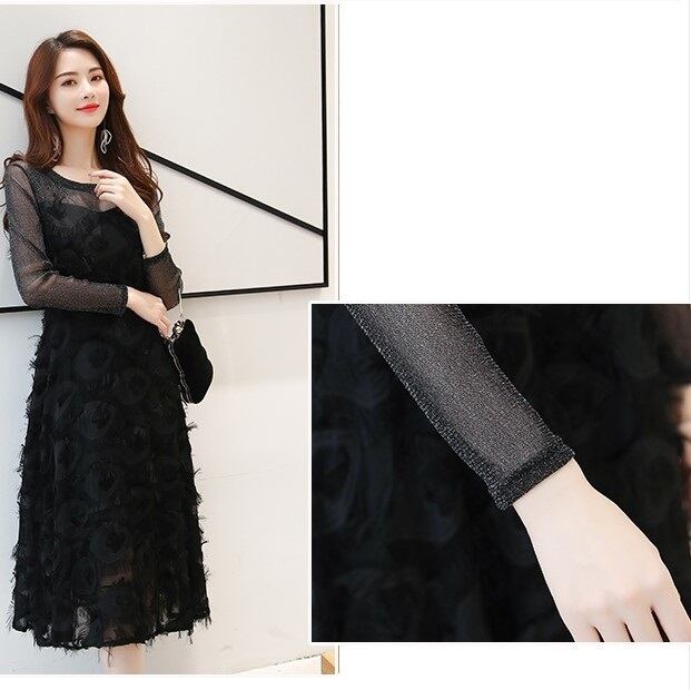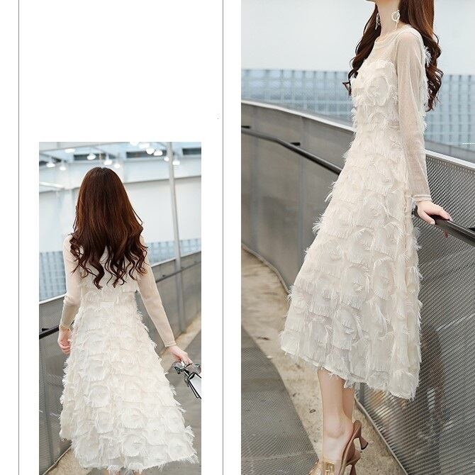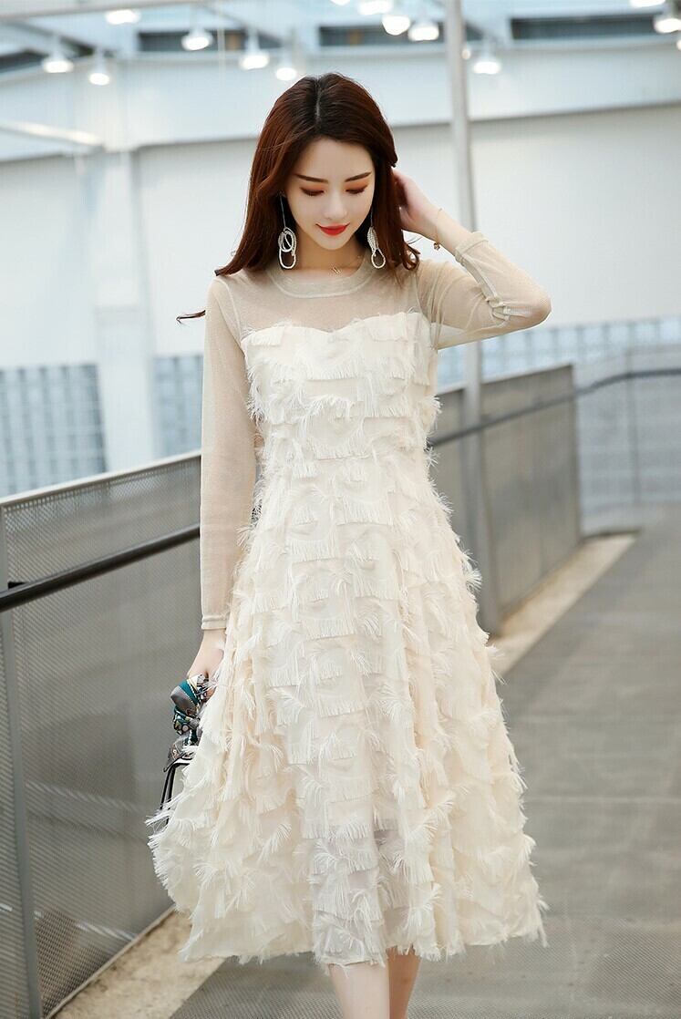 全2色 ワンピース ドレス ミモレ丈 ひざ丈 長袖 レース タッセルフェザー きれいめ ビスチェ風 大人可愛い フェミニン お呼ばれ お出かけ デート パーティ ホワイト ブラック 秋冬