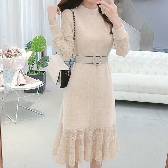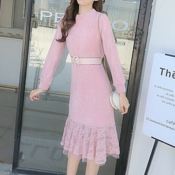 全2色 ニットワンピース ドレス ミモレ丈 フィッシュテール レース 長袖 スタンドカラー 大人可愛い フェミニン お呼ばれ お出かけ デート 通勤 ピンク アプリコット 秋冬