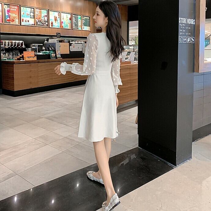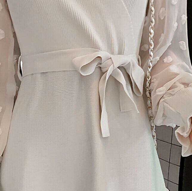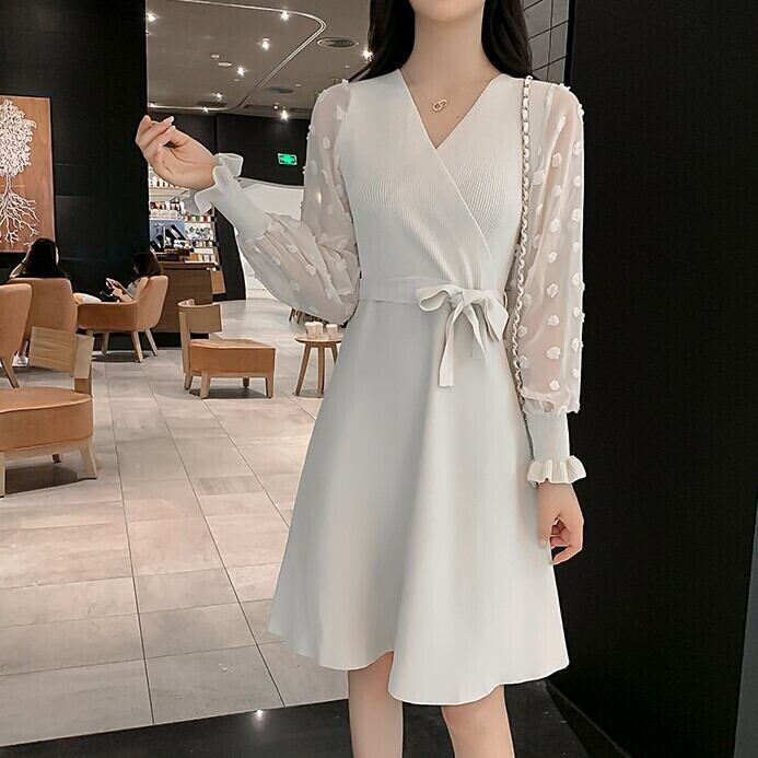 ワンピース ドレス ミニワンピース Vネック ウエストリボン 無地 長袖 フレアスカート Aライン シースルー シフォン フェミニン フォーマル 大人可愛い お呼ばれ パーティ 結婚式 二次会 ホワイト 秋冬