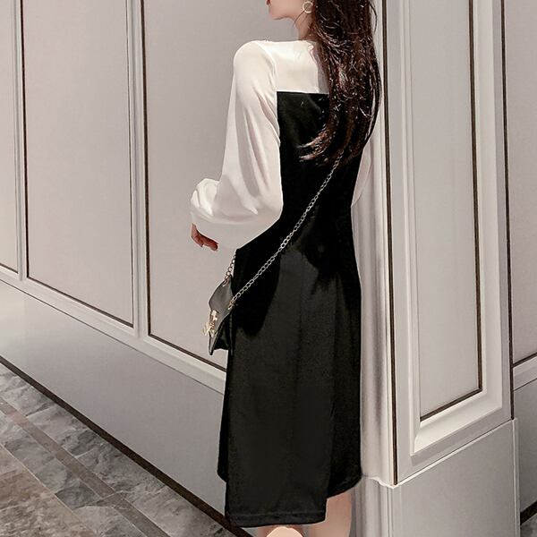 ワンピース ひざ下丈 ミモレ丈 フロントボタン バイカラー 重ね着風 腰ポケット 長袖 Iライン 秋冬 レトロ 大人可愛い デート お出かけ デイリー 20代