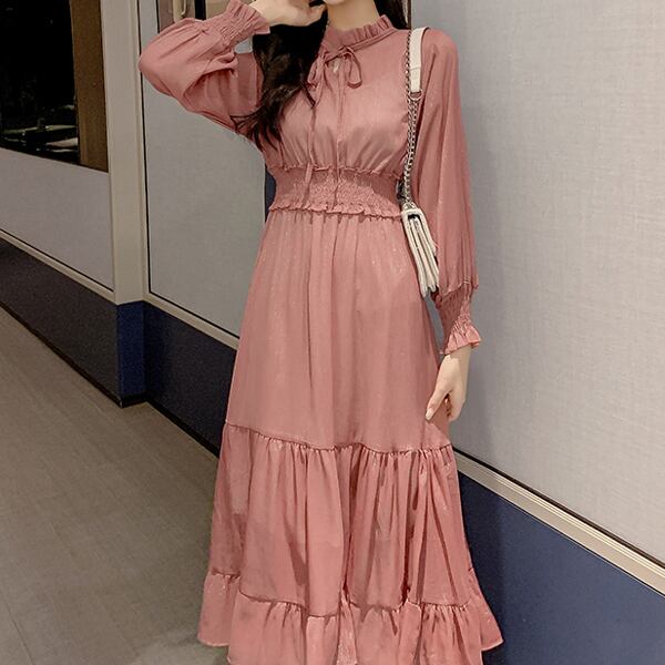 全2色 シフォンワンピース ひざ下丈 ミモレ丈 長袖 シフォン ハイウエスト 秋冬 レトロ 大人可愛い デート お出かけ デイリー 20代