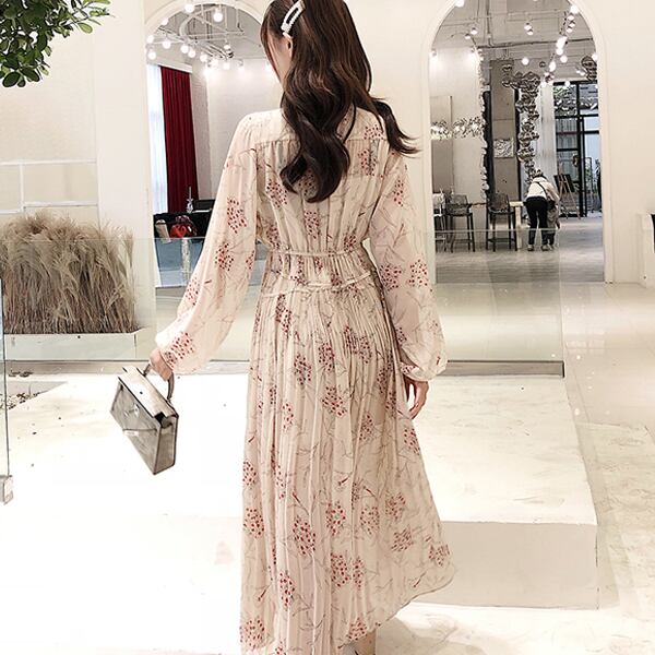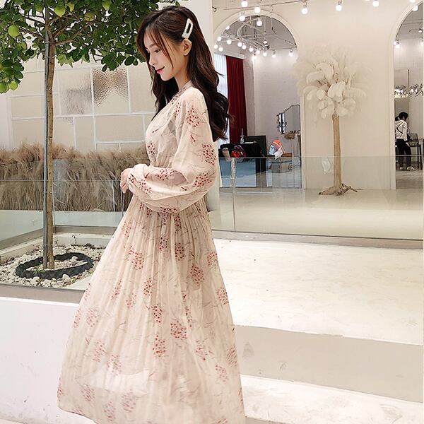 ワンピース ひざ丈 ミモレ丈 花柄 シフォン ランタンスリーブ ラウンドネック 秋冬 レトロ 大人可愛い デート お出かけ デイリー 20代