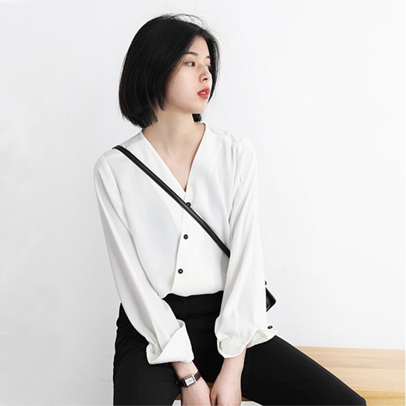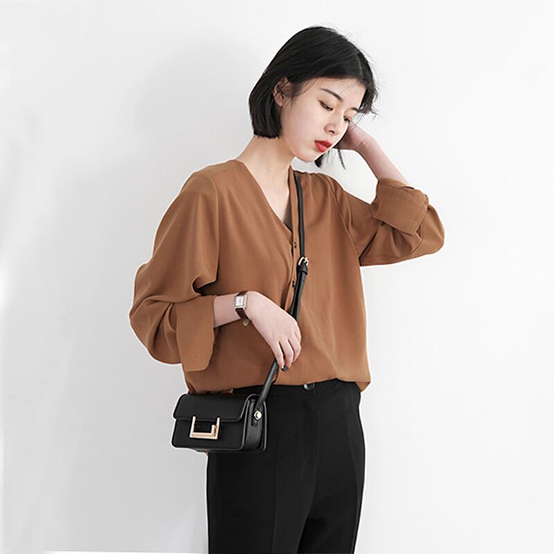 全2色 ブラウス シャツ Vネック ボリューム袖 ロールアップ 長袖 斜めバックル ヴィンテージ 風 無地 ゆったり 着痩せ 大人可愛い 抜け感 フェミニン とろみ きれいめ 秋冬 お出かけ デート くすみカラー
