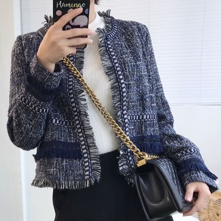 フリンジの存在感あるラインデザインが目を惹くツイードジャケットです!すっきりとしたボトムスやワンピースと合わせて、スタイリッシュなセットアップコーディネートもおすすめです♪