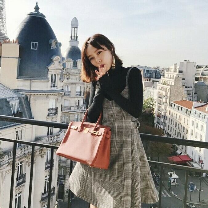 黒いシンプルなセーターにグレンチェックのジャンパースカートをセット。