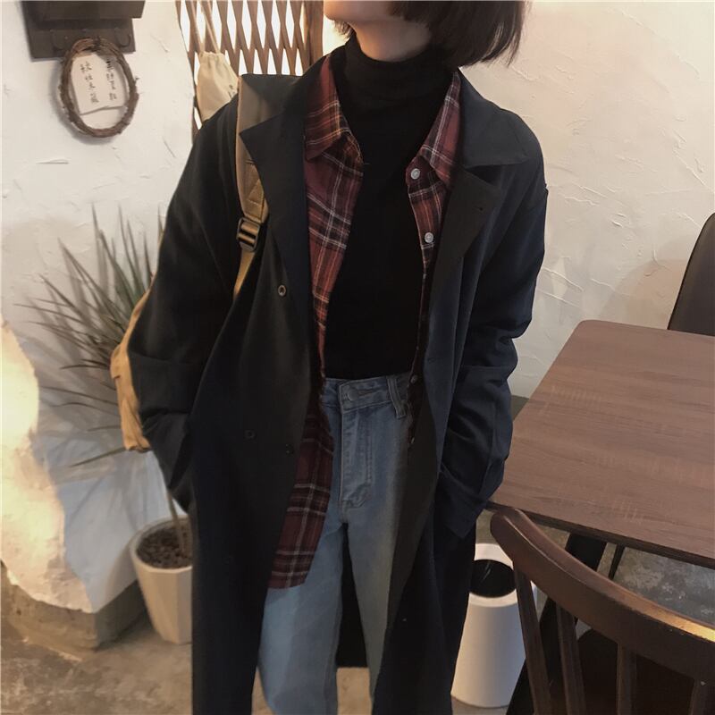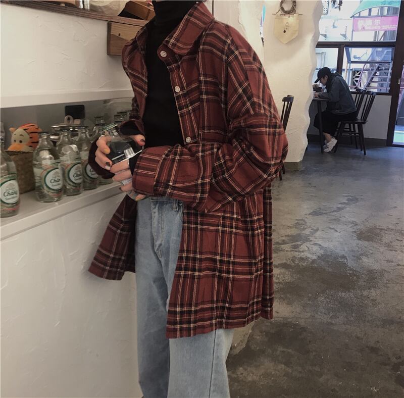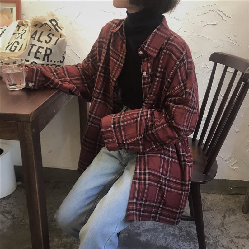 全2色 シャツチェック柄 長 レディース レジャー カジュアル レトロ ゆったり 体型カバー