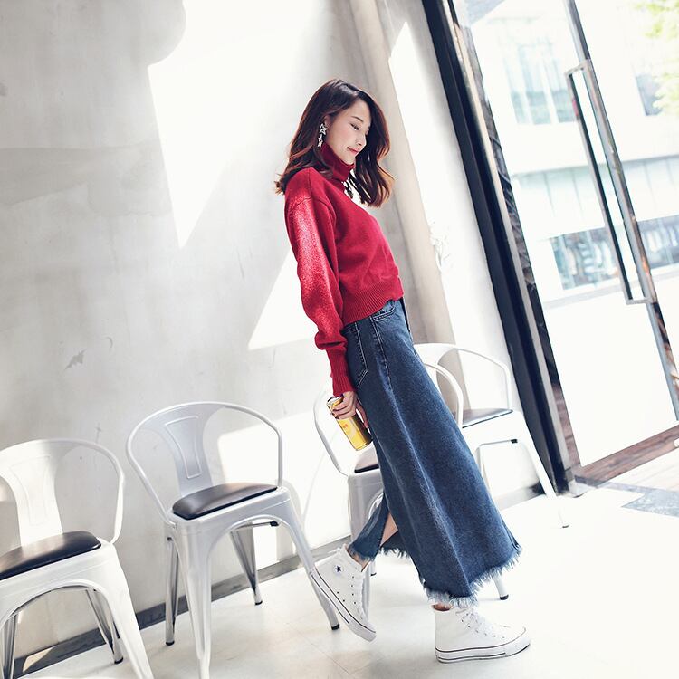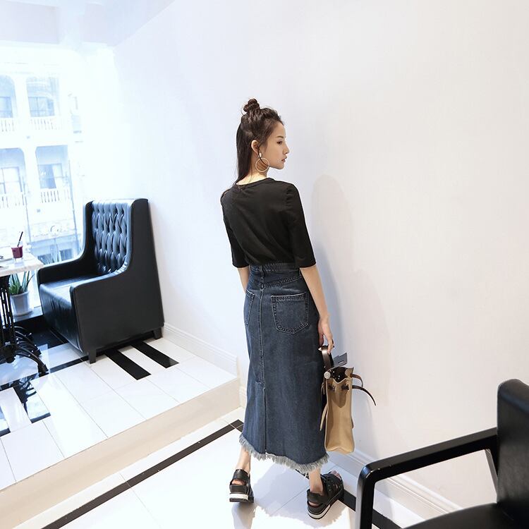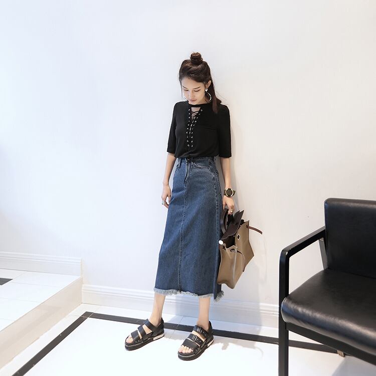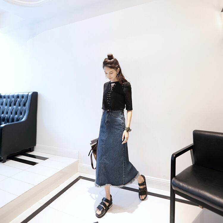 デニムスカート ミモレ丈 ひざ下丈 無地 カジュアル フリンジ ダメージ加工 ハイウエスト カジュアル 大きいサイズ 大人可愛い お出かけ 通学 ブルー 秋冬