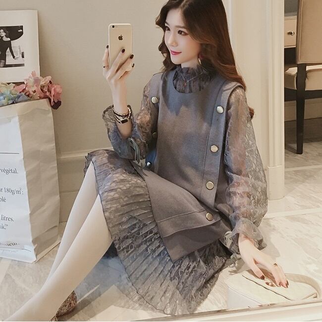 全2色 ワンピース ミモレ丈 レース ハイネックラッフル リボン フロントボタン ガーリー 重ね着風 秋冬 フォーマル 長袖 スリムドレス デート 大きいサイズ