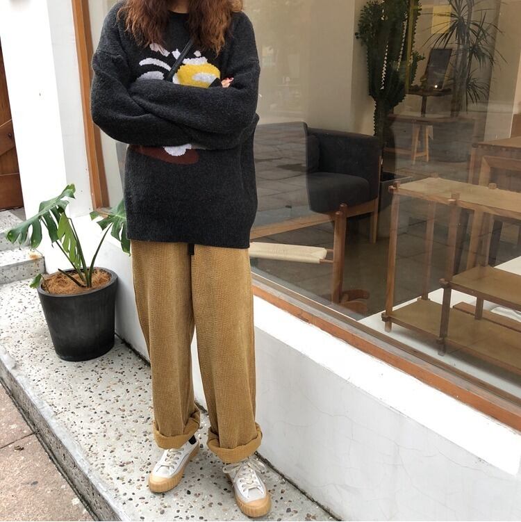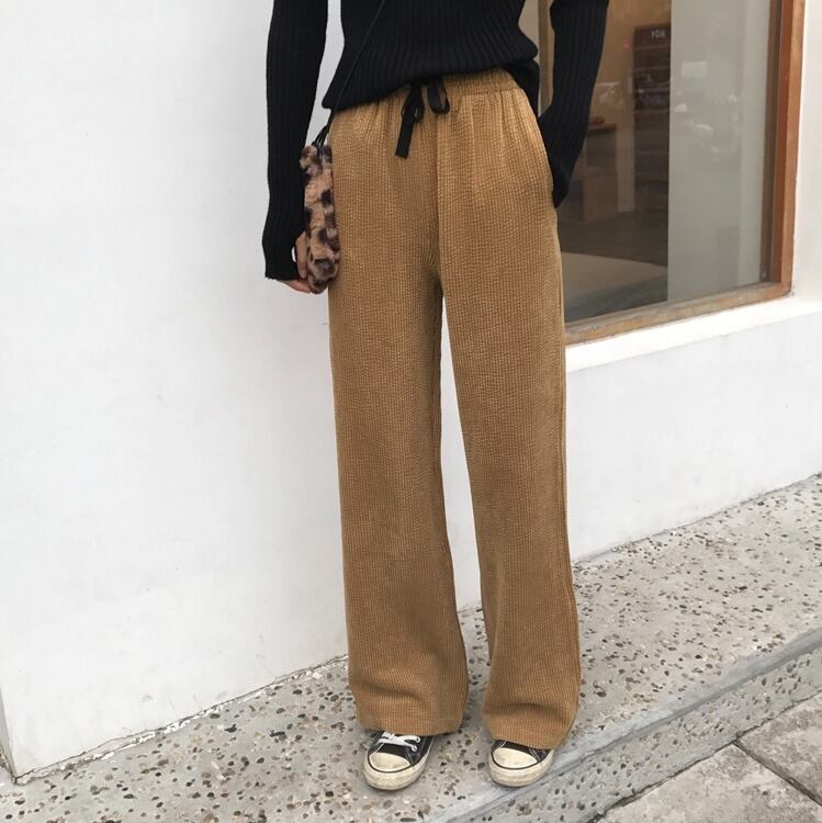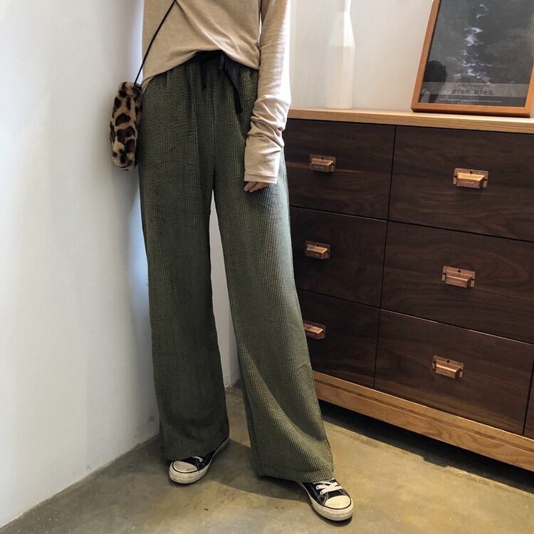 全3色 コーデュロイド パンツ 長ズボン 春秋 ゆったり レトロ ワイドパンツ ウエストゴム 薄い ハイウエスト カジュアル くすみカラー デイリー使い 大人 ポケット イエロー グリーン ブラック