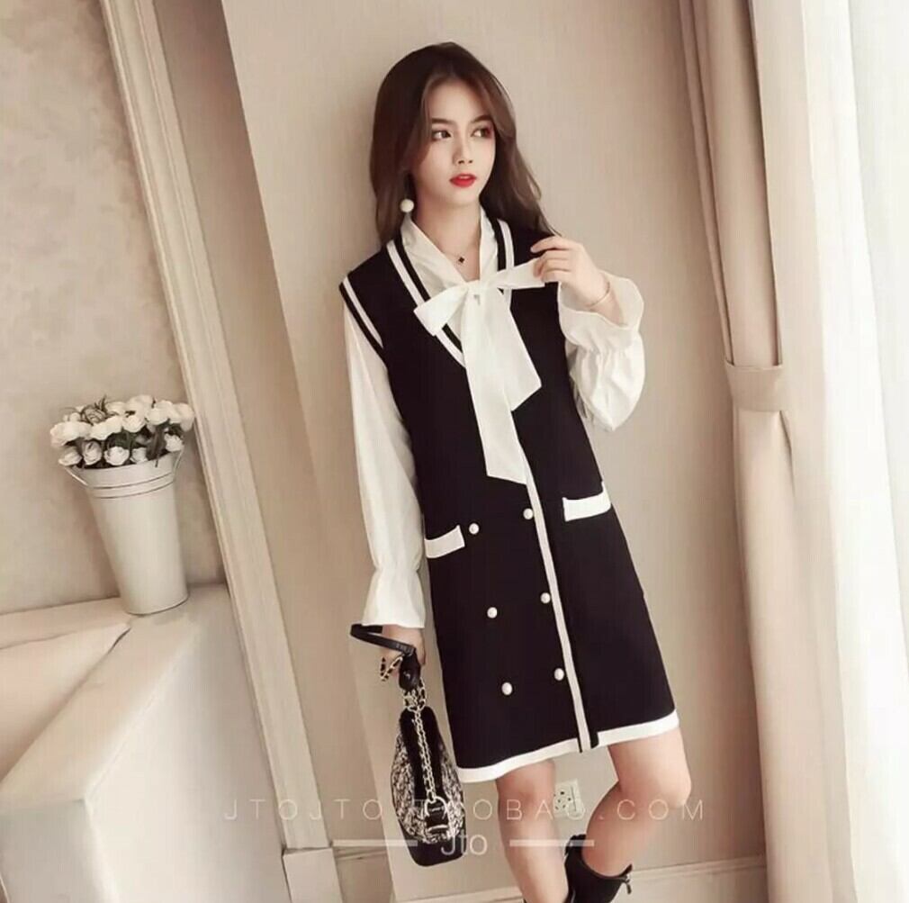 ツーピース ワンピース セットアップ ボウタイ ブラウス Aラインワンピース ワンピ 冬 ビショップ袖 ポケット 黒地 シンプル デート リボン