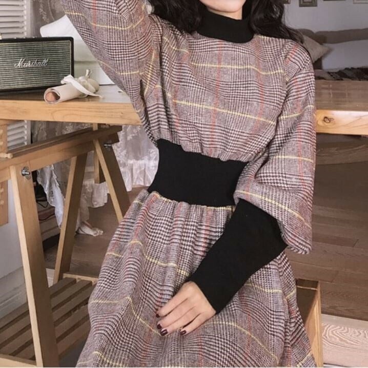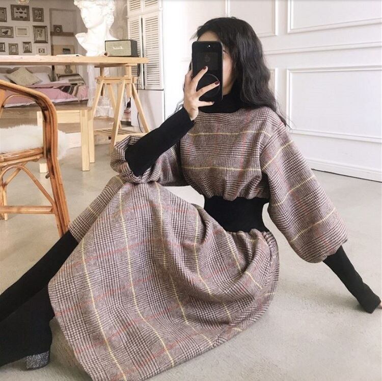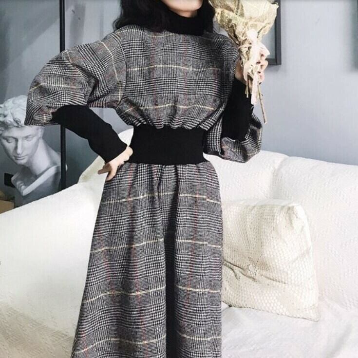 全2色 ワンピース ミモレ丈 ひざ下丈 長袖 ハイネック パフスリーブ レトロ チェック ヴィンテージ カジュアル ゆったり 体型カバー 大人可愛い 秋冬 お出かけ 通学 通勤 ブラック ブラウン