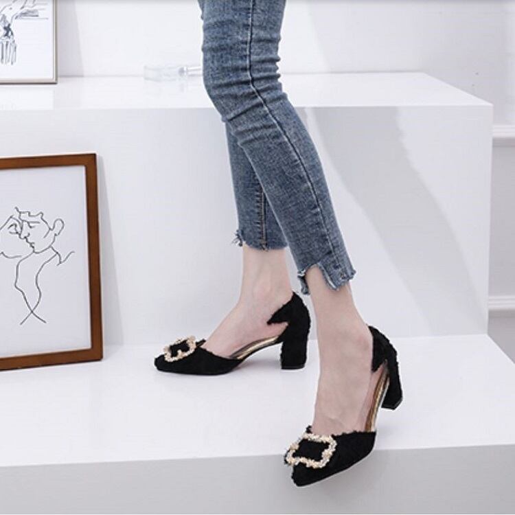 全3色 パンプス ローヒールパンプス ポインテッドトゥ バックル ビジュー付き きれいめ 歩きやすい フォーマル フェミニン カジュアル お出かけ ブラック ピンク ベージュ