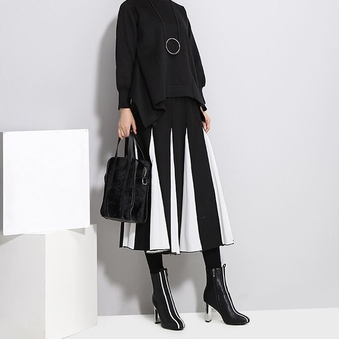 全2色 バイカラー スカート ハイウエスト サイドジッパー ウエストゴム ワイドスカート ひざ下 秋冬