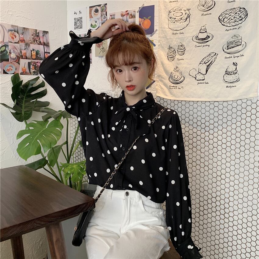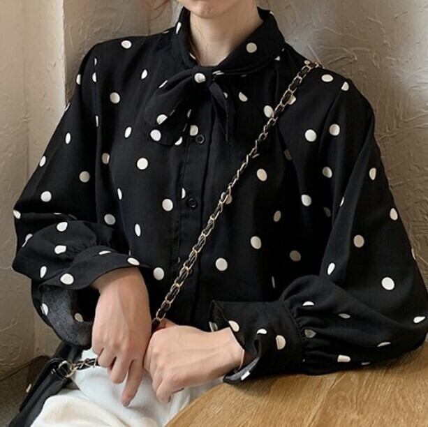 全2色 ボウタイブラウス ドット ブラック ホワイト 秋冬 長袖 ボリューム袖 大人可愛い ガーリー カジュアル お出かけ デート