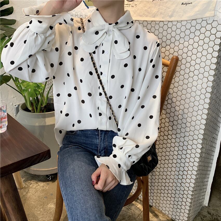 全2色 大人可愛い ドット柄ボウタイシャツ
